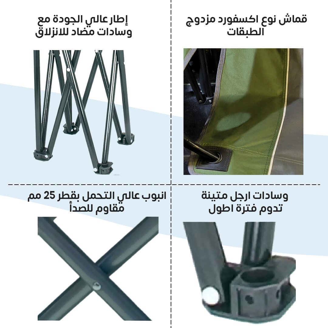 هذا الكرسي مثالي لجميع مغامراتك الخارجية، سواء كانت في الرحلات، أو أثناء التخييم، أو حتى للاستمتاع بجلسة هادئة في الحديقة. بفضل تصميمه المريح وخفة وزنه، ستجده الخيار المثالي لكل نشاطاتك في الهواء الطلق.