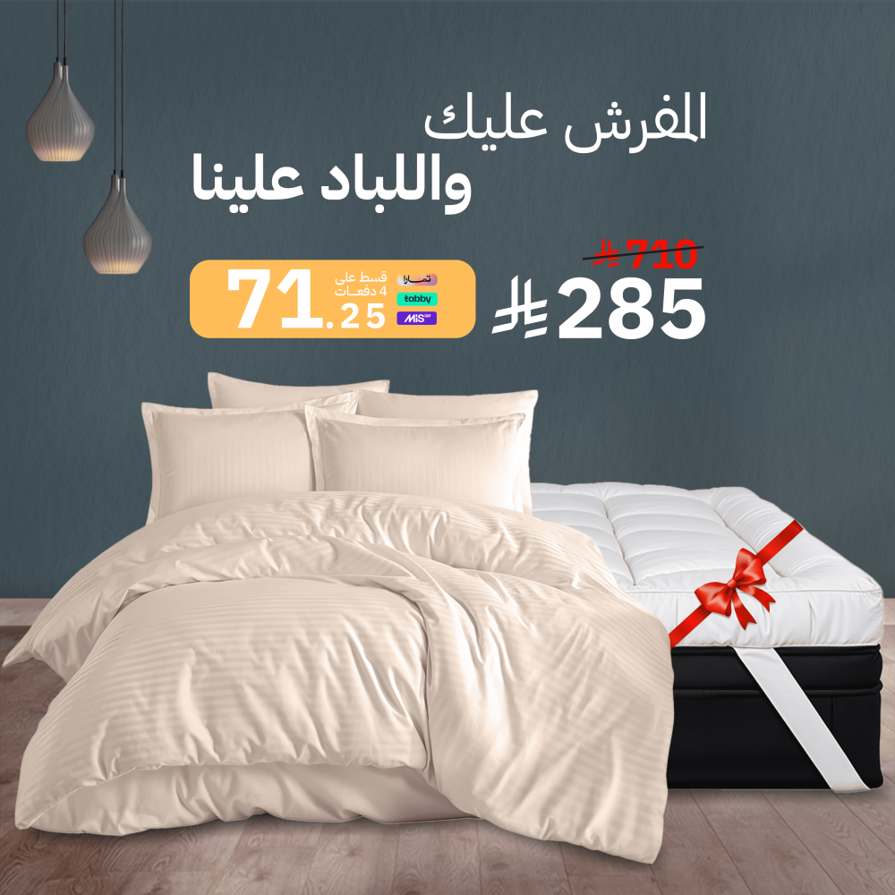 جدد سريرك وعيش احساس الفخامة و الراحة مع بكج المفرش عليك و اللباد علينا المصنع في المملكة العربية السعودية بأفضل الخامات الفندقية الناعمة اللي تلامس احساس احلامك وقت النوم