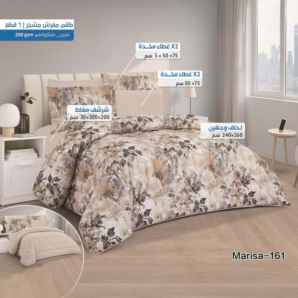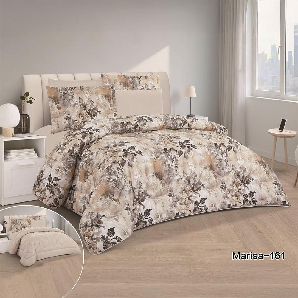 أضف لمسة فاخرة إلى غرفة نومك مع طقم المفرش وجهين موديل Marisa-161 باللون البيج المشجر.تصميم يجمع بين الوجه السادة الأنيق والوجه المزخرف برسومات ورود بدرجات البني والرمادي يمنح الغرفة طابعاً كلاسيكياً عصرياً.خامة فندقية ناعمة بجودة عالية توفر راحة نوم مثالية تدوم طويلاً.
