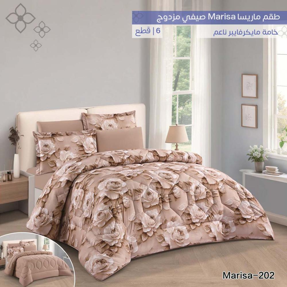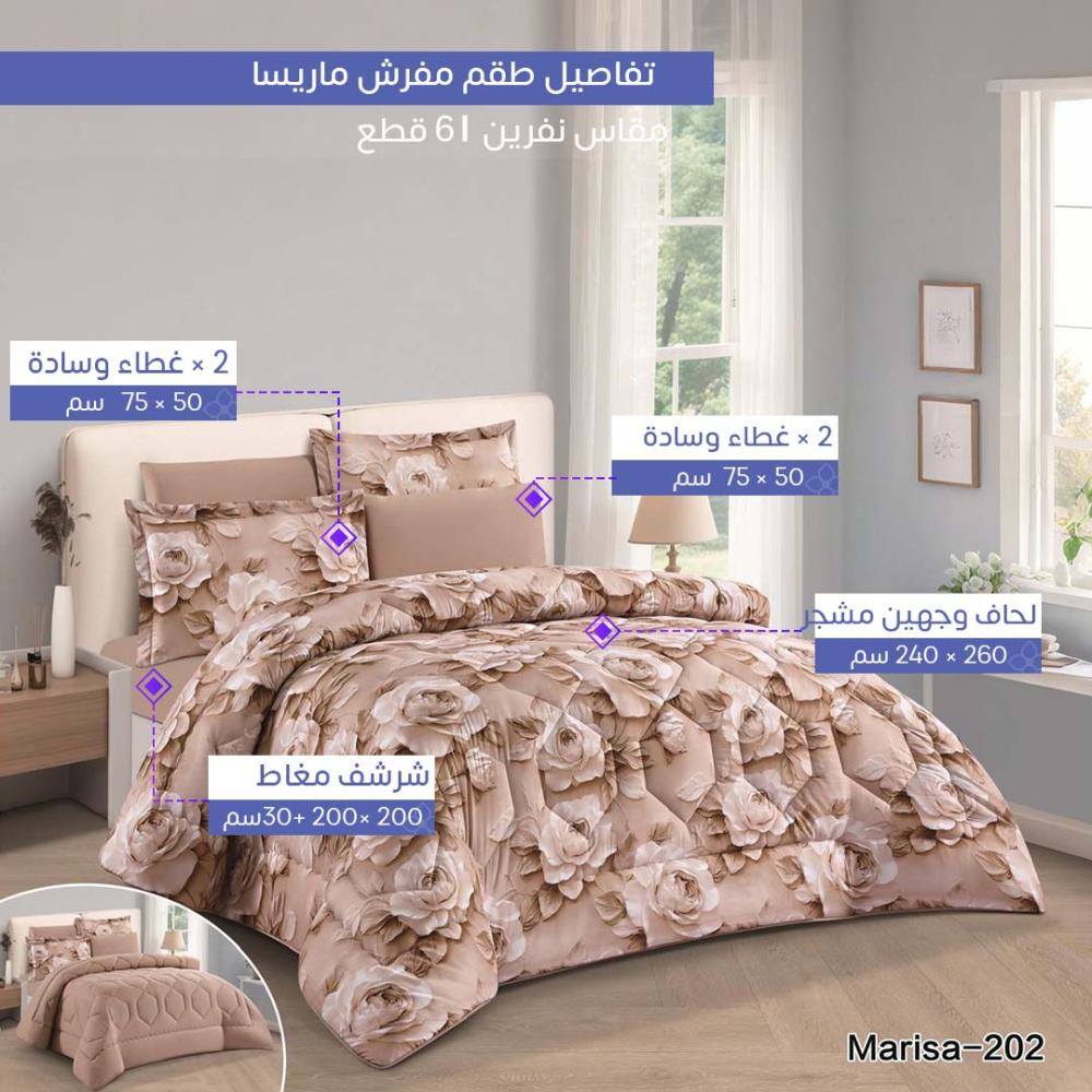 جدد غرفتك بلمسة عصرية مع طقم مفرش ماريسا موديل marisa-202 المزدوج. يأتيك بـ 6 قطع تلبي احتياجاتك وتضمن لك الراحة والمظهر الجذاب في آن واحد.
