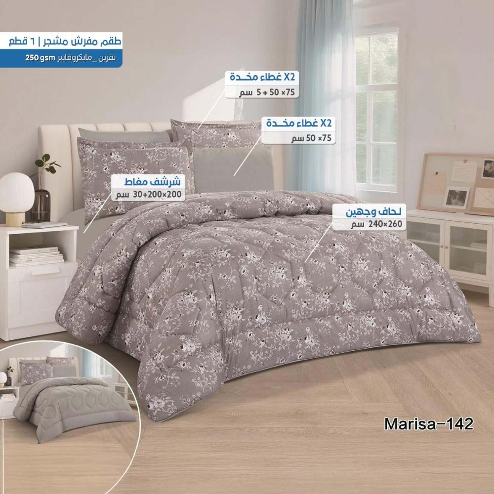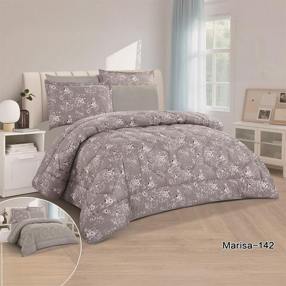 أضف لمسة أنيقة إلى غرفة نومك مع طقم المفرش وجهين موديل Marisa-142 باللون الرمادي الغامق.تصميم عملي يجمع بين الوجه السادة العصري والوجه المشجر المزدان برسومات زهور راقية.خامة ناعمة عالية الجودة تمنحك راحة نوم فندقية متكاملة مع لمسة فاخرة تدوم طويلاً.