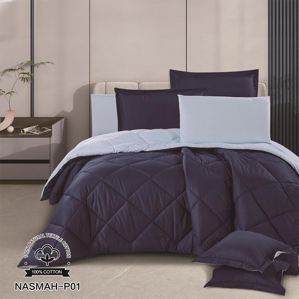 امنح غرفتك تجديداً فورياً مع طقم مفرش قطن 100% بتصميمه العملي (وجهين) ولونه كحلي المميز. يجمع هذا الطقم بين برودة القطن الطبيعي ونعومة الملمس لنوم صحي ومريح، مع مرونة قلب المفرش للحصول على إطلالة جديدة كلياً تناسب ذوقك العصري