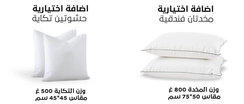 إضافة اختيارية: يمكن طلب مخدتين فندقية أو تكايتين ديكور أو كلاهما، والسعر يُضاف عند التحديد.