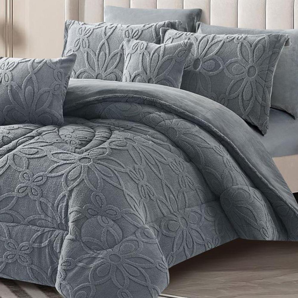 طقم لحاف Velvet Bloomمخمل  فرو بتفاصيل بارزة دانتيل | لون رمادي
