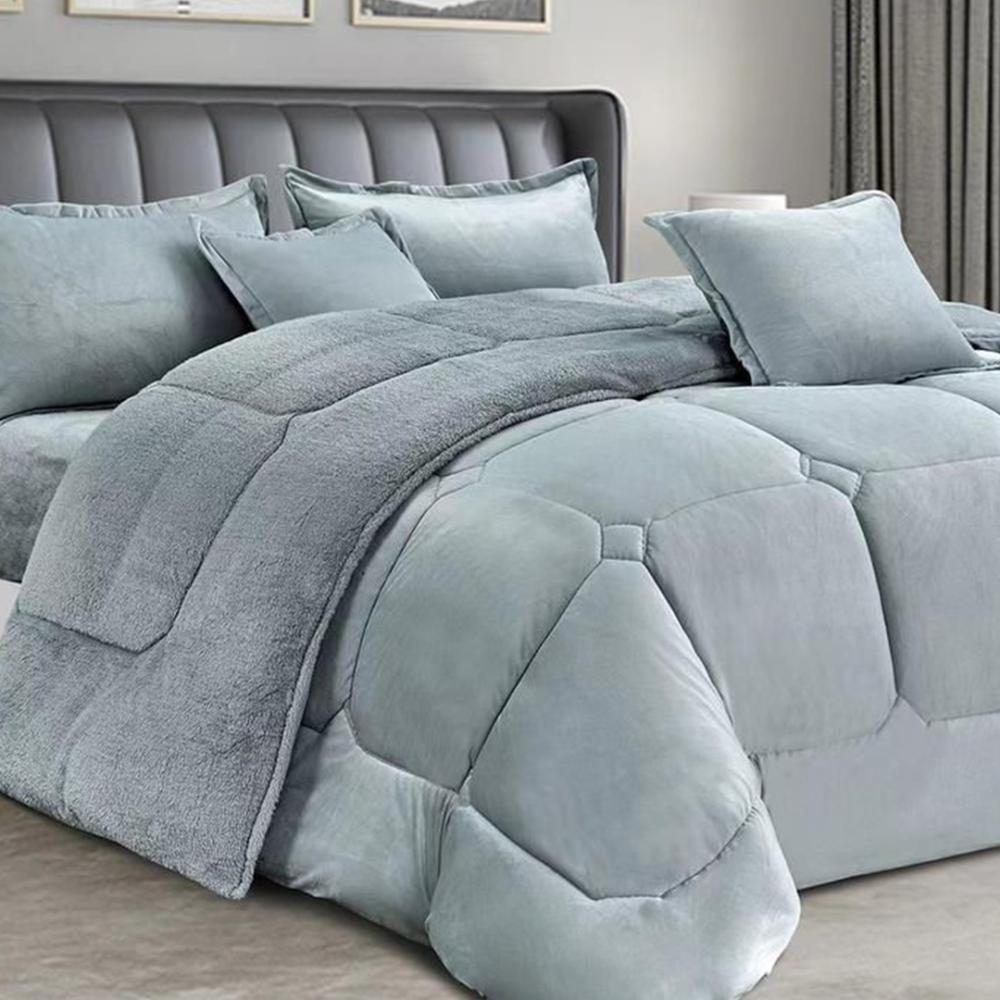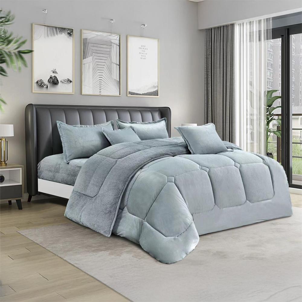 طقم لحاف شتوي مفرد بلون سادة موديل CMBP-009 يمنح غرفتك دفئًا وأناقة عملية. وجه مخمل سوبر ناعم بملمس مريح ووجه فرو خفيف للاحتفاظ بالحرارة بتوازن. الحشوة من ألياف دقيقة عالية الجودة لتوزيع ثابت بدون تكتل. الشرشف مطاطي بعمق 40 سم يحيط المرتبة بإحكام ويثبت مكانه طوال الليل. تصميم سادة سهل التنسيق مع مختلف الديكورات.